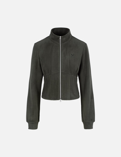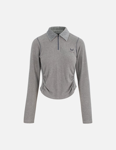 MF Collared Zipper Versatile Floral Gray Gathered Slim Waist Cropped Top