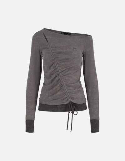 MF one-shoulder oblique elastic pleated lace-up gray top
