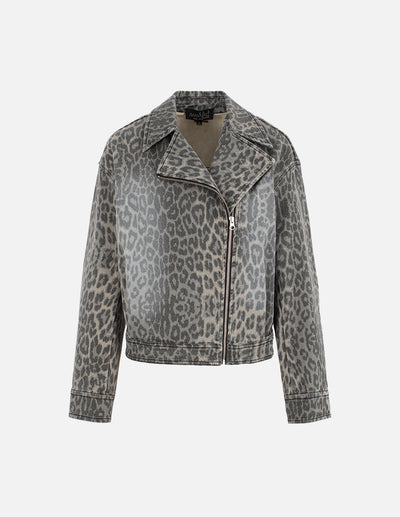 MF neat large lapel slant placket zipper gray leopard print washed denim jacket