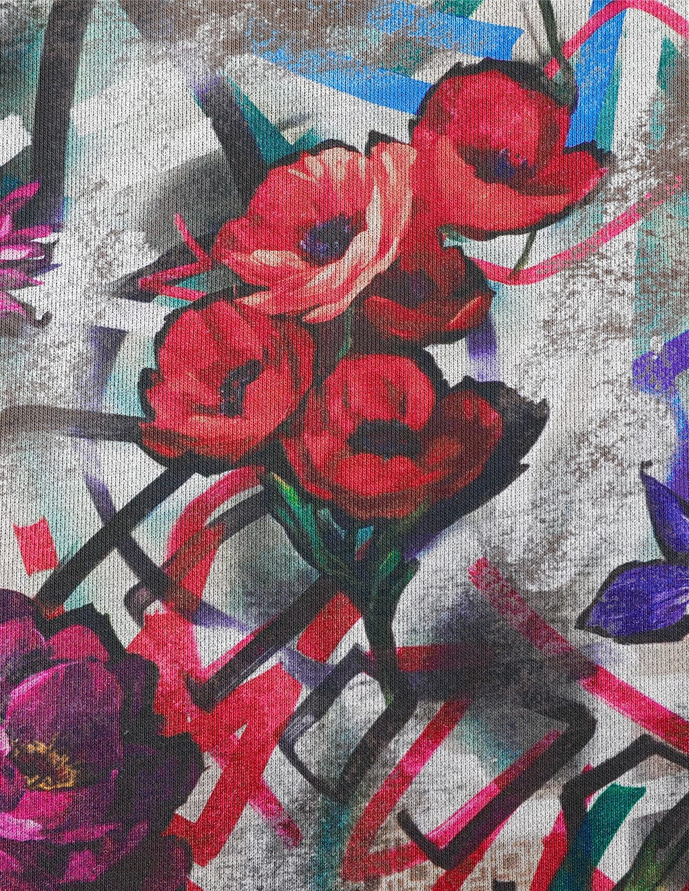 Knitted splicing pure cotton fabric has a collision of textures, and is delicate and soft, taking into account comfort and warmth, showing a unique personality. Pop film series has graffiti-like pattern design, showing cool personality and creating fashionable and innovative ideas. The fashionable and loose fit easily hides the flesh and adds a trendy and cool charm.