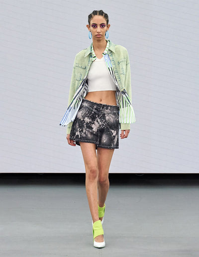 Cotton washed denim with good fit retention, soft hand and comfortable wearing. Waist brushed details High waist and frayed edge design, the upper body looks slim and trendy. Bleach tie-dye emphasizes street-cool attributes. Leather LOGO patch on the back waist Strong workmanship and stylish style.