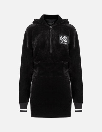 Glossy diamond-burnished velvet gives this dress a touch of stretch and softness. The hooded sweater design covers hips and adds a unique logo stamp for a playful twist on classic black.